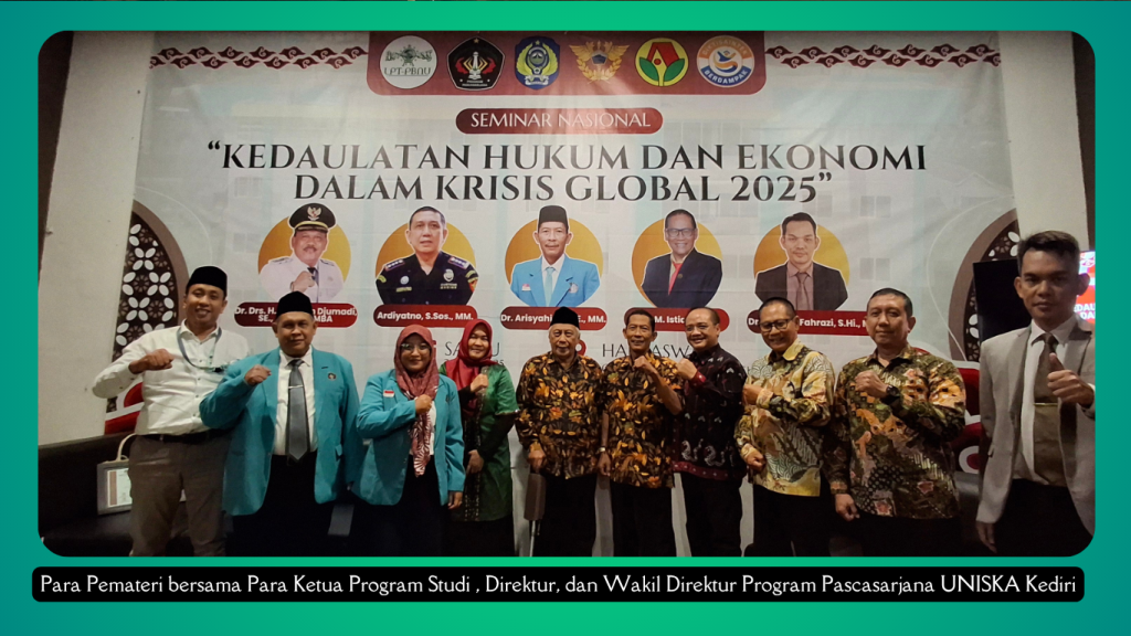 Kediri, 21 Juni 2025 – Sebagai peran serta Perguruan Tinggi dalam kontribusinya memberikan wawasan kepada mahasiswa dalam bidang hukum dan ekonomi di masa krisis global 2025, Program Pascasarjana Universitas Islam Kadiri (UNISKA) Kediri menggelar Seminar Nasional dengan tema utama “Kedaulatan Hukum & Ekonomi dalam Krisis Global 2025”. Acara yang di gelar di Hall Aswaja, Lt.07 Gd. Ulil Albab Kampus UNISKA Manisrenggo ini berhasil menarik perhatian para akademisi, praktisi, mahasiswa, serta perwakilan pemerintah daerah yang antusias memahami tantangan dan peluang di tengah ketidakpastian global saat ini.